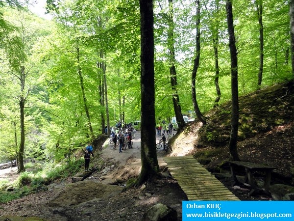 Kısa parkur yeniden yolla birleşti ve şelaleye geldik. Burada yemek molası vereceğiz. Bisikletim çamur içinde kalmış.